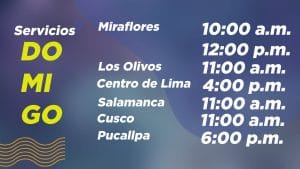 Tenemos servicios presenciales en nuestra sede de Los Olivos a las 11:00 a.m. en Av. Universitaria 4939. Los Olivos, entre Naranjal y Universitaria.